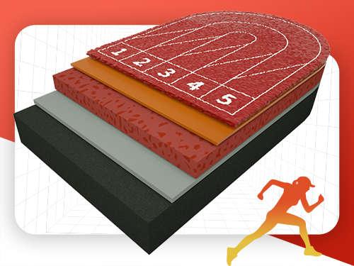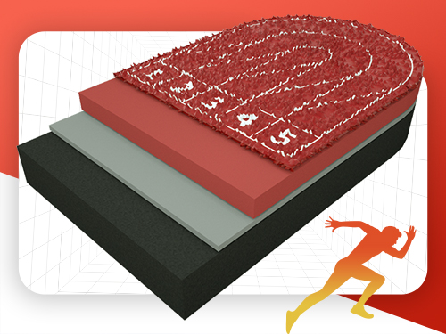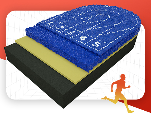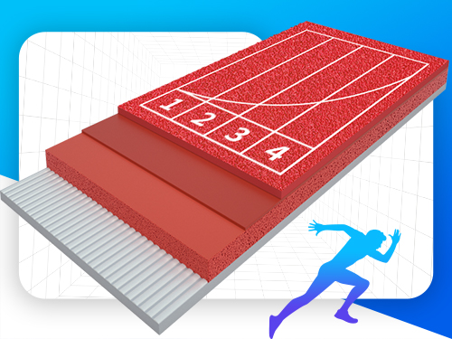 半預(yù)制型跑道中的彈性層是工廠預(yù)制成型的卷材成品,無需現(xiàn)場澆筑,直接在現(xiàn)場攤開并完成粘接,然后在彈性卷材上依次澆筑運動面層的工序,最終得到一條厚度和性能都均勻穩(wěn)定的田徑跑道。