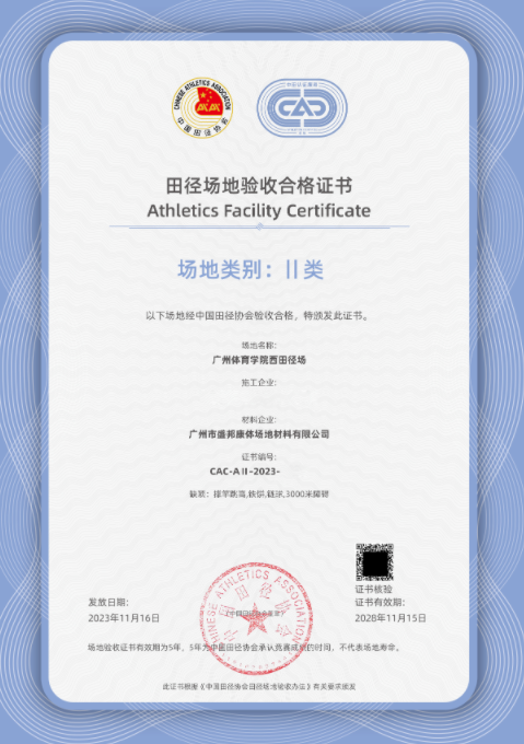 After checking diameters of layout , appearance, color, thickness, evenness and line marking of the track facility by certified inspectors, Guangzhou Sport University Track Facility was awarded as Class II Facility by Chinese Athletics Association.